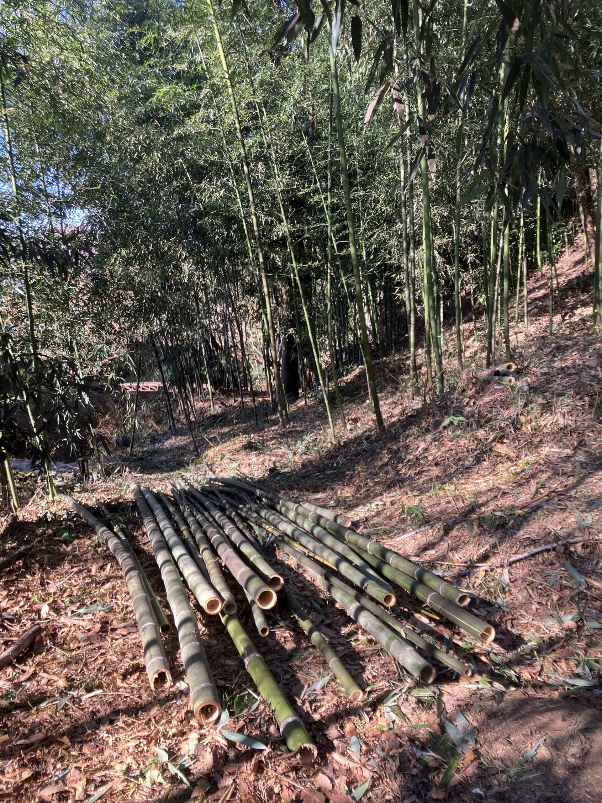 伐った竹は、6メートル程度に切り揃えて茅葺屋根の土台に利用されるそうです。また桃の木の枝支えにも使われるそうです。粉砕した葉や枝は里山に撒かれ良い腐葉土になります。まったく無駄のない循環です。こうして、自然資本である竹林、里山を維持し成長させて次世代へ繋いでいきます。