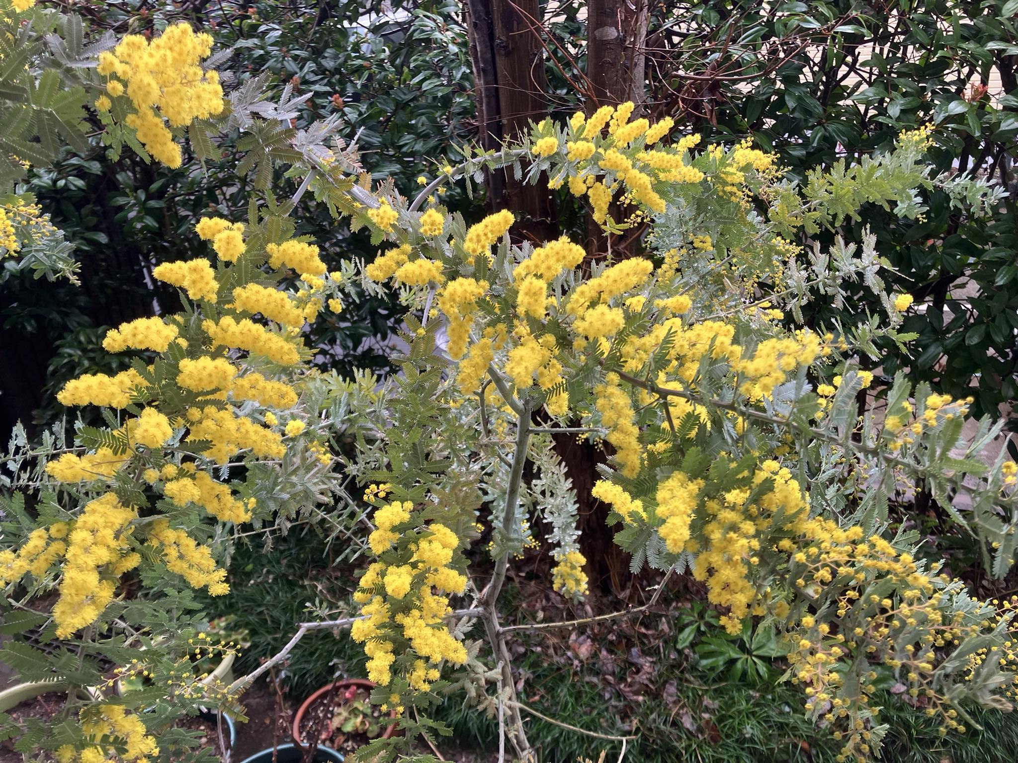 2026.03.01 ミモザ満開にして自由奔放 廣瀬悦哉 季語は「ミモザ」 春 我が家の鉢植えのミモザが満開です。 3月8日は国際女性デー。ミモザはそれを象徴する花です。すべての素敵な女性にこの花を贈ります。 鉢植えで育てるのは難しい花です。水捌けの良い土を好みますが、水を枯らすとすぐに葉が茶色くなります。枝も四方八方に伸びて奔放です。花が咲いた後は思い切って枝を切り詰めます。 ミモザの声に耳を傾けます。